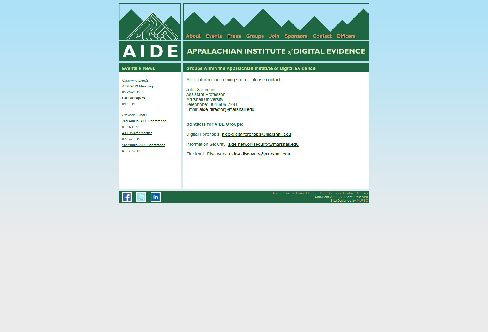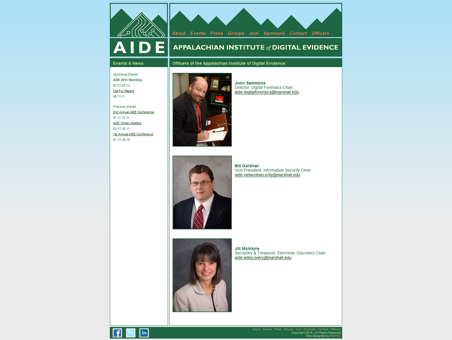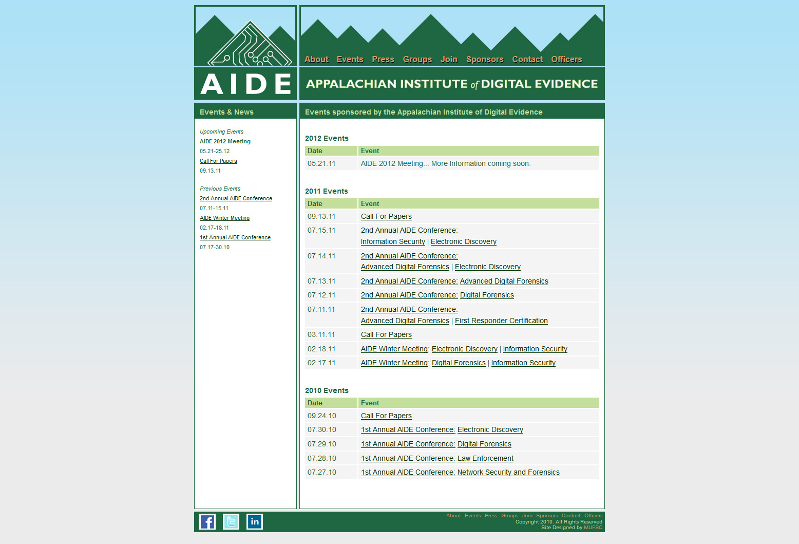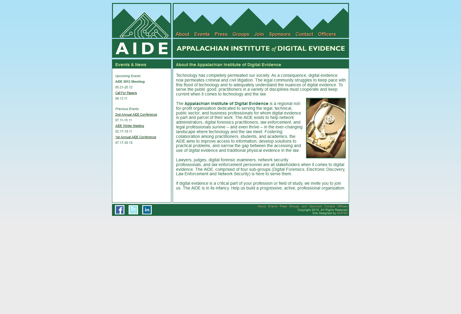 I designed, developed, and maintained the first version of the Appalachian Institute of Digital Evidence (AIDE) website. The website was developed using custom HTML 4 and CSS 2 code. I was also responsible for designing the AIDE logo.
