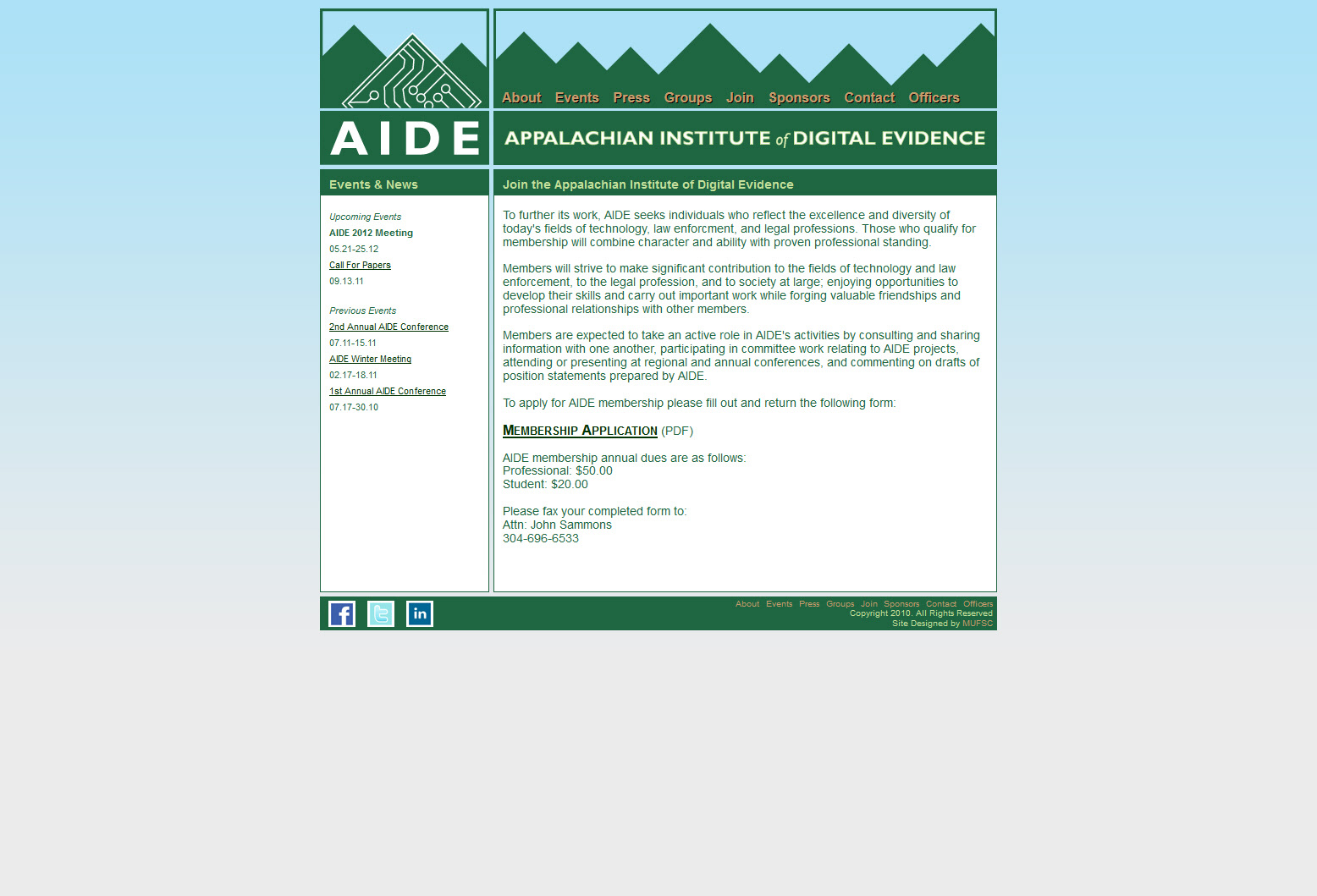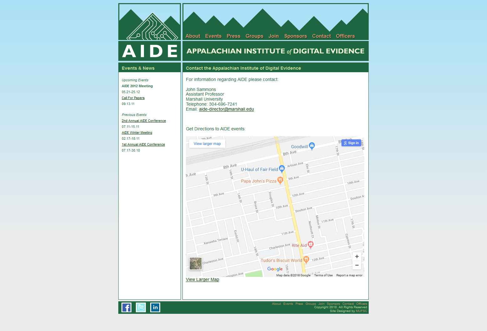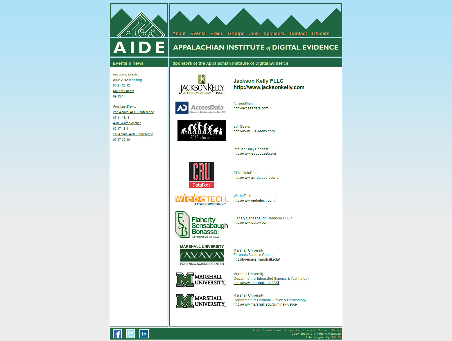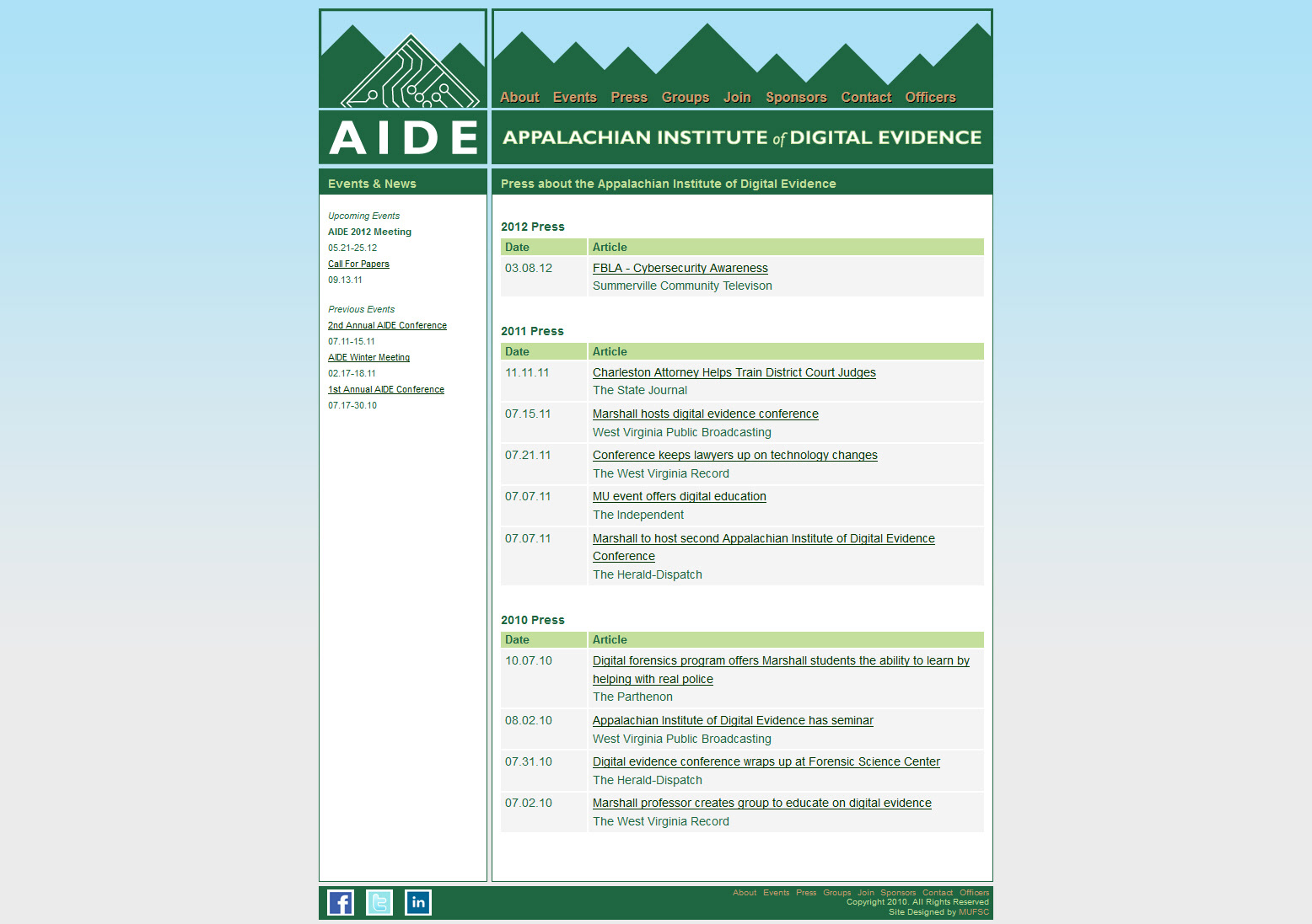 I designed, developed, and maintained the first version of the Appalachian Institute of Digital Evidence (AIDE) website. The website was developed using custom HTML 4 and CSS 2 code. I was also responsible for designing the AIDE logo.