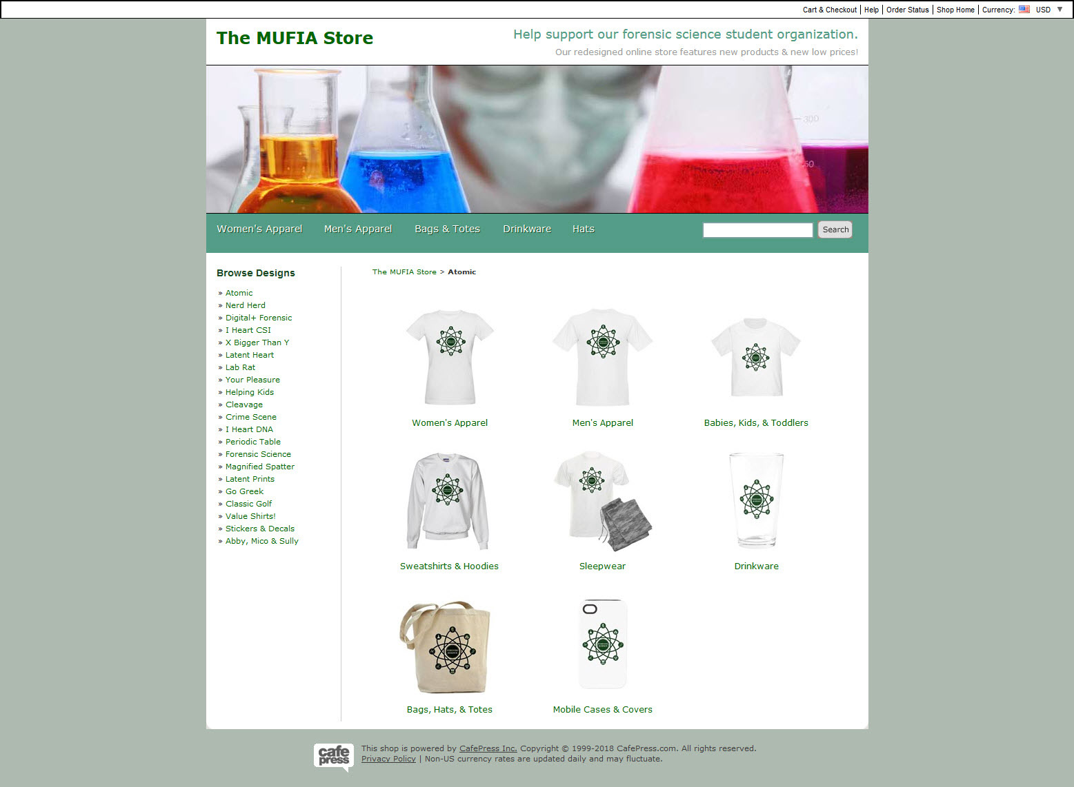 Using print-on-demand service CafePress, I setup an online store for the Marshall University Forensic Identification Association (MUFIA) student organization. I coded custom CSS, optimized graphics, and integrated Google Analytics. I also created custom designs for apparel and merchandise using Adobe Illustrator and Photoshop.
